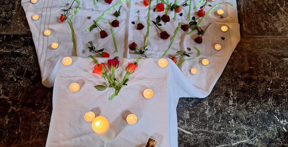 Symbolhandlungen mit Bändern, Steinen und Rosen sowie das gemeinsame Entzünden von Kerzen liessen die Gedanken sichtbar und persönlich werden. Rund um eine brennende Kerze entstand ein gemeinsames Bild, das das Leben jedes Einzelnen vor Gott zum Ausdruck brachte.